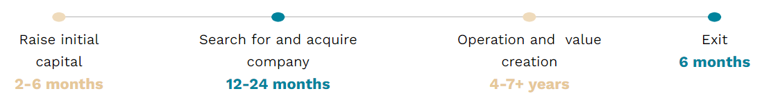 A Search Fund consists of an individual or team who will spend up to two years trying to find a company to acquire and subsequently run. A typical search fund consists of 4 phases