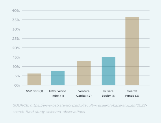 Search Funds access acquisition opportunities not easily available to traditional investors which leads to acquiring great assets at extraordinary prices which delivers superior returns. With an aggregate IRR of over 35% and aggregate MOIC of over 5x, Search Funds are the highest performing asset class over the last 30 years
